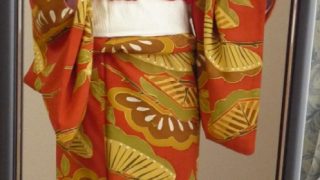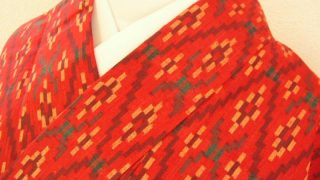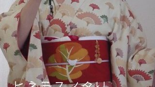 母からのお下がりです。母のサイズはちょっと小さめなので、私が着ると腕がにょっきりのこんな感じです^^;。この着物は小紋なんだけれど、肩山を境に模様が上を向くように作られている「付け下げ小紋」というもの。普通の小紋よりもやや格上の扱いなので、...