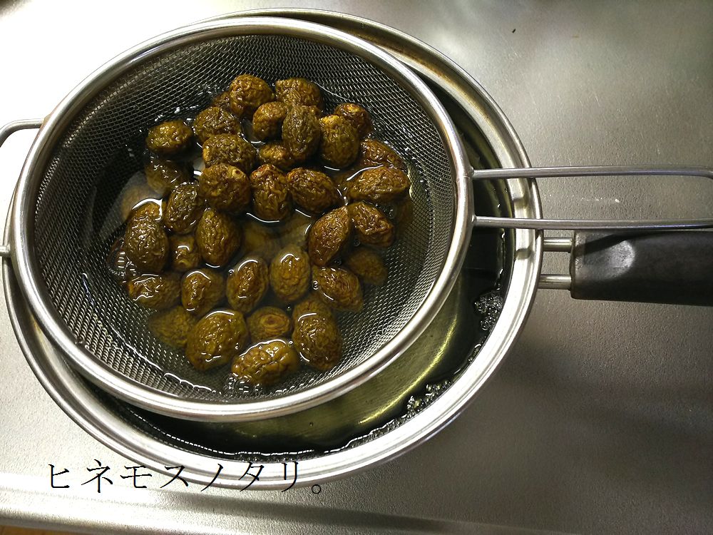 4.梅とシロップを分けて、シロップを鍋に入れる。