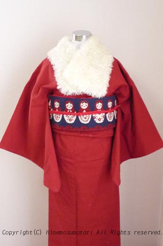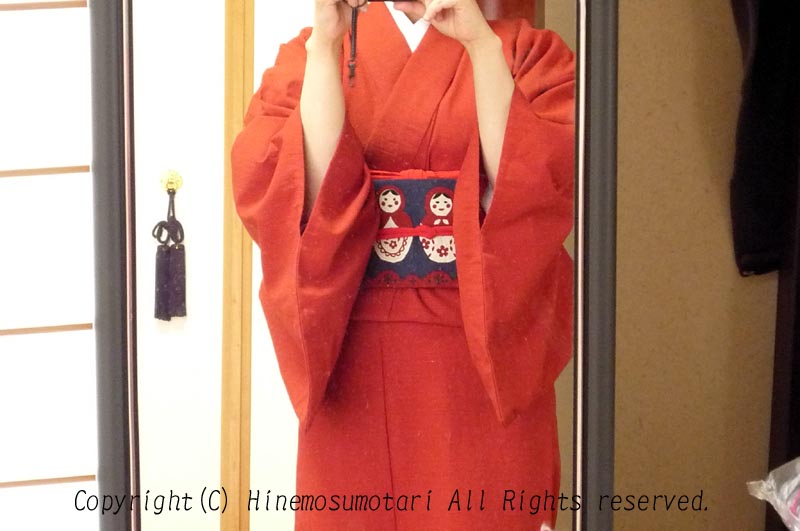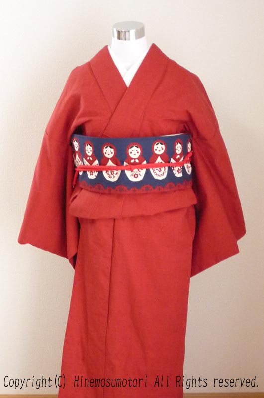 マトリョーシカの名古屋帯、ポリエステルの手作り帯揚げ・帯締めと。