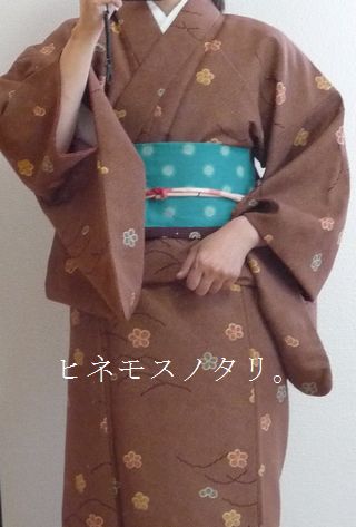 エンジ色の匹田模様に梅の柄が散らしてあるあっさりとした柄のきものです。