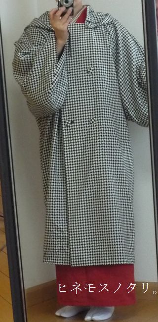 千鳥格子のコート X Facebook LINE Pinterest コピー 2025.07.14 居内商店さんで購入したものです。素材はウール。第一ボタンにひっかけるフードがついています。袖丈を気にせず使えます。