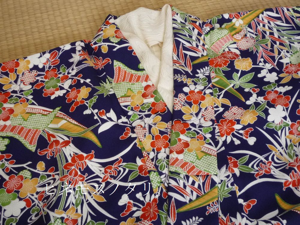 紺地に華やかな柄の小紋。