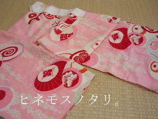ピンクの地に傘の柄と梅の花の模様の長襦袢。