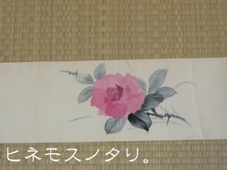 生成りの塩瀬の地に手描きのバラの花の名古屋帯。