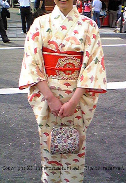 お下がりの名古屋帯、ピンクのゴブランのハンドバッグと合わせています。