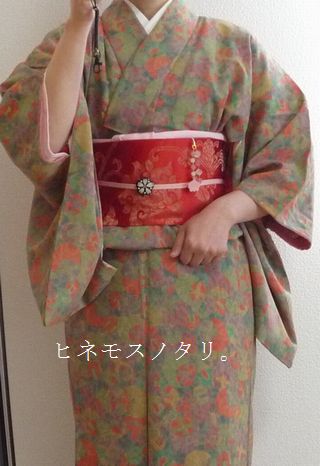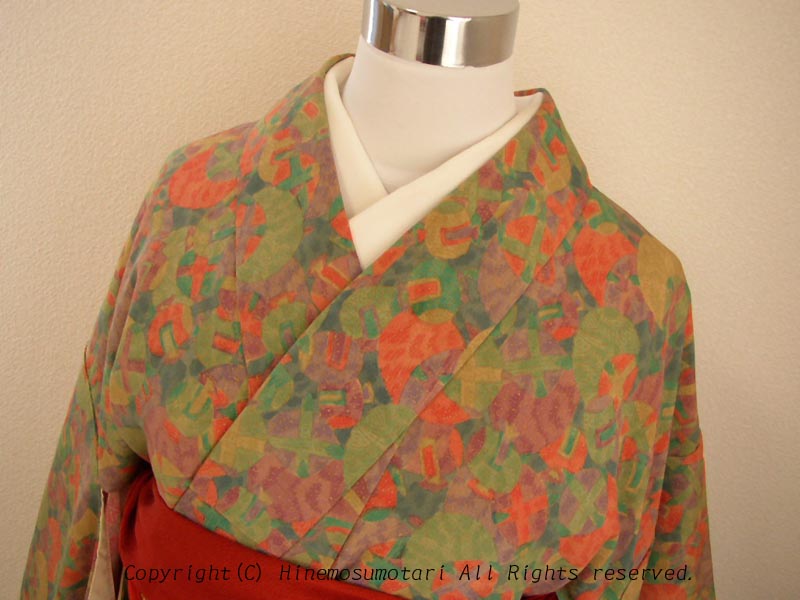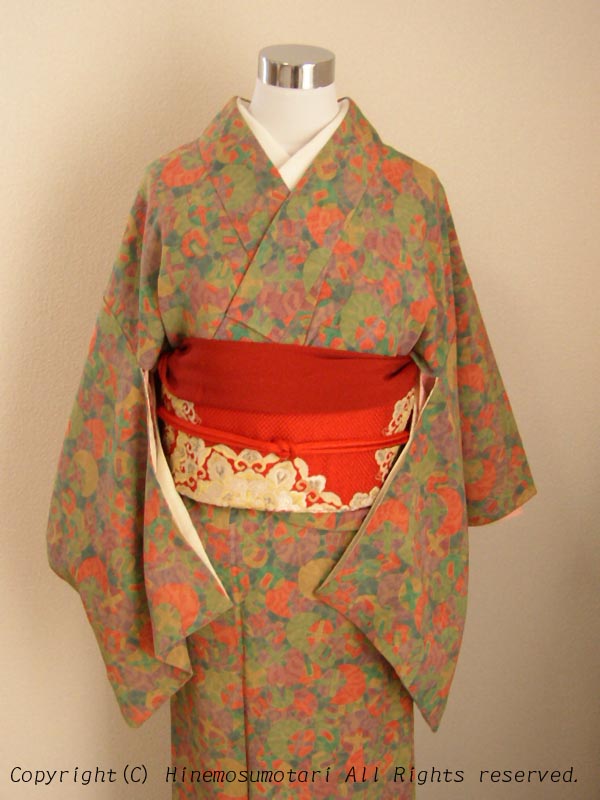 地色は緑系なのですが、パステル系の色使いなので明るい小物を合わせれば意外と着やすい着物です。