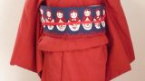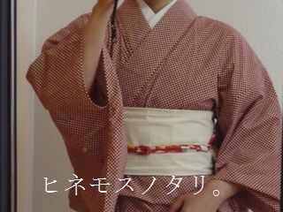 エンジと生成り色を交互に配した、市松模様の着物です。