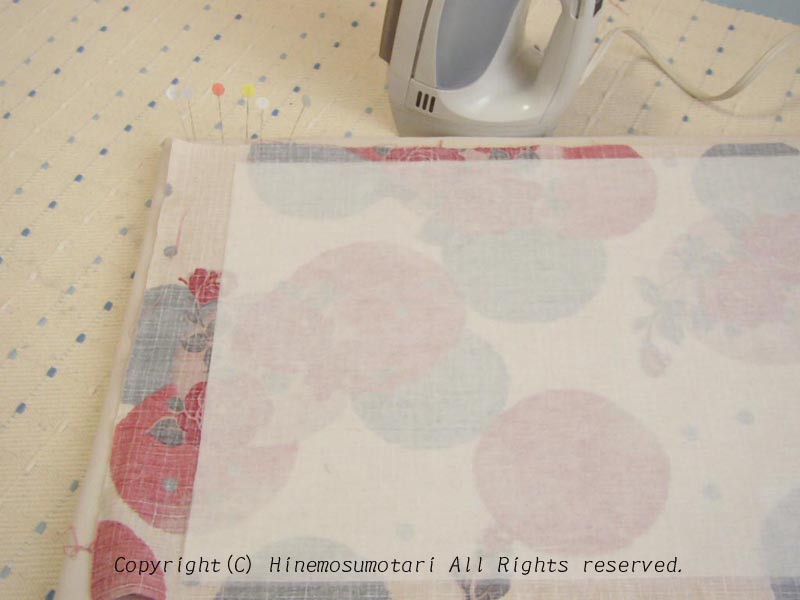 お太鼓にする方の端に裏布を中表に合わせ、両端を縫います。