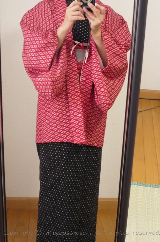 デパートのレンタル品落ちのフェアで手に入れたポリエステル素材の羽織です。