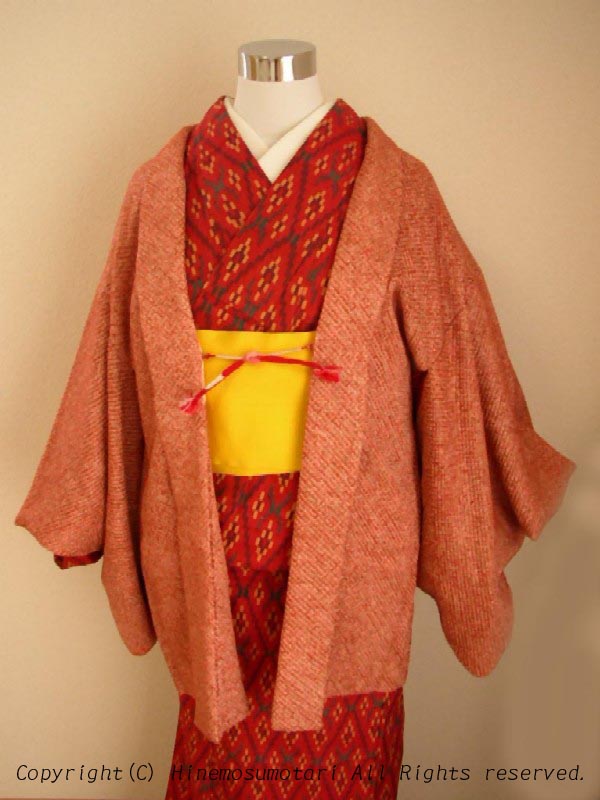 これはお揃いの羽織がアンサンブルでついている紬ですが、あんまり好きではないので絞りの羽織を合わせてます。