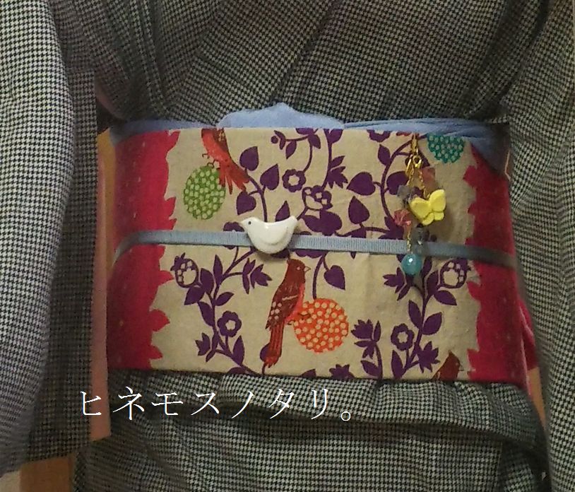 帯揚げと三分紐(真田紐で手作り)は水色、帯留めは白い鳥、根付に落雁モチーフの蝶々を合わせた、新年に運気を上げるコーデです。