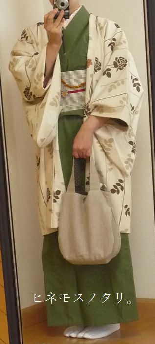 リネンの手提げバッグ X Facebook LINE Pinterest コピー 2025.07.21 手作り作家さんのバッグです。 素材はリネン。なすびのようなコロンとした形がかわいいです。木綿やウールなどの着物に持っています。 ご近所の用事に。抹茶色の綿紬と合わせました。