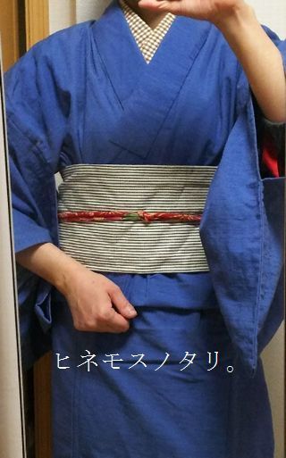 ほとんど上っ張りで隠れてしまってますが、あかね色の綿紬と同じ素材で仕立てたブルーのバージョンです。