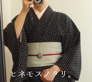 帯をヒッコリーのヤの字作り帯に変更、桜の帯留めと三分紐はエンジ色でアクセントにしました。