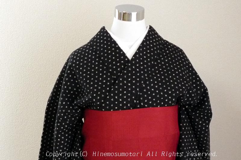 きものが黒、柄と帯が生成り色、帯揚げと三分紐が赤で色数少なくまとめてみました。