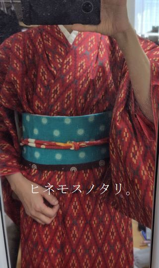 簡単に着られるよう、絣柄の紬に手作りのヤの字作り帯を合わせました。
