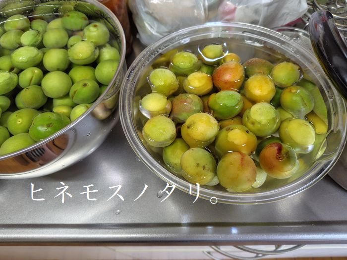 梅シロップ5キロを漬け、体力の限界を感じたので残りのカリカリ梅は翌日にしようと水に漬けたまま一晩おいたところ…全部やわらかくなってしまったので、かろうじて上の方に浮いていた500gほどをカリカリ梅にして、残りはやはり梅シロップにしました。