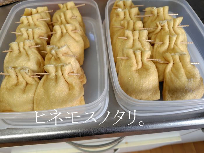 大根とおでんの汁で炊き込んだのと、甘辛く似ていなり餅みたいにしたのと二種類作りました。