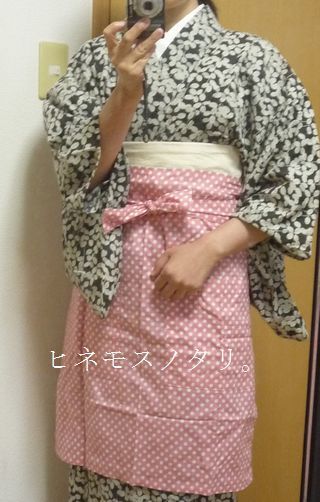 浴衣兼用の薄手の着物に半幅作り帯、前掛けの一揃えです。