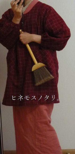 ピンクの綿紬にエンジのチェックの割烹着。